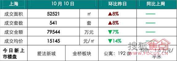 据同策数据显示,10月10日全市商品房共成交5.25万平方米,环比上升8%。当天动迁房成交2.38万平方米,占到总量的45%。商品住宅(剔除动迁房)成交1.93万平方米,环比下降13%。商品房成交均价在前一个交易上扬后再次下跌,为15145元/平米,环比下降14%。除办公产品有不错表现外,其他各产品都不同程度的呈下降态势。金地艺境城已连续多日盘踞商品住宅销售榜首,该案目前户型种类齐全,均价在1.8万元/平米,另有电梯花园洋房在售,均价2.2万元/平米,可售余量充足。