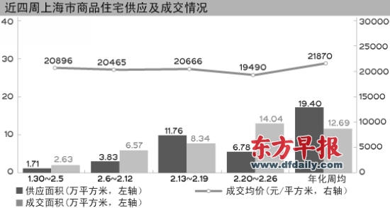 [提要] 上周(2月20日-2月26日)上海市商品住宅成交面积为14.04万平方米,环比(较前周)上涨68.32%;成交均价则环比下跌5.69%,至19490元/平方米。相关业内人士认为,上海楼市成交量连续第四周出现回升态势,且环比增幅扩大,主要是部分降价盘成交带动所致。