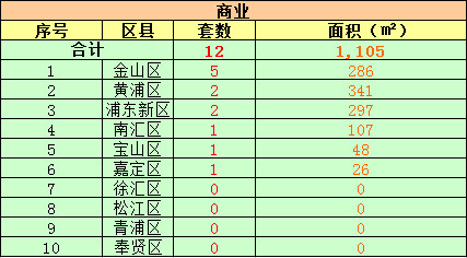 在商铺方面,今日共成交12套。金山区今日共成交5套,成交面积286平米。黄浦区和浦东新区均成交2套,成交面积分别为341平米和297平米。