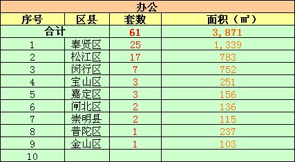 在写字楼方面,今日上海共成交61套,成交面积3871平米。其中奉贤区位居第一,成交套数25套,成交面积1339平米。松江区成交17套,位居第二。闵行区成交7套,位居第三。