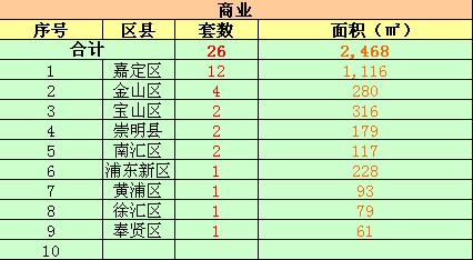 在商铺方面,今日上海共成交26套,成交面积2468平米。嘉定区、金山区、宝山区分别位居一、二、三名的位置。