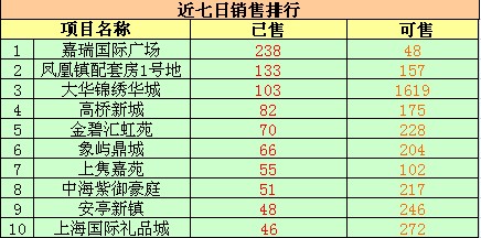 在近7日销售排行方面,嘉瑞国际广场位居第一。已售238套,可售48套。位于长兴的凤凰镇配套房1号地近日销售成绩大好,近七日已售133套,可售157套。浦东新区的大华锦绣华城已售103套,可售1619套,位居第三。