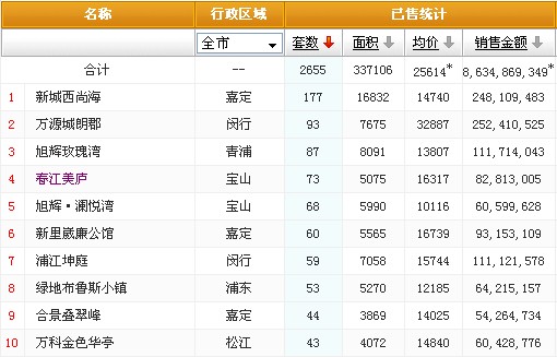 在单个项目成交方面,位于嘉定的新城西尚海成交套数位居第一,成交面积16832平米,成交均价14740元每平米。新城西尚海在售40-71平米酒店式公寓,总价在40-65万之间,最低38万元起低楼层房源已经售完。