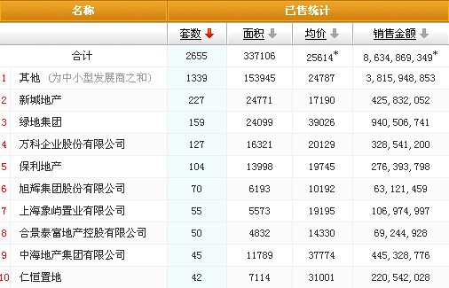 在发展商方面,,上周大部分房源的成交来自一些本地的或者单个项目的开发商。新城地产以227套的成交总量首登榜首,排名第二的绿地集团,上周成交量159套。