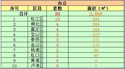 写字楼办公方面,今日共成交33套,成交面积总2059平方米。其中,松江区今日成交13套,成交面积634平方米,排名第一。闸北区、嘉定区今日成交4套,并列位于第二,成交面积分别为384平方米、264平方米。