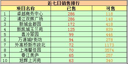 从近七日的销售排行来看,昨日榜首浦江双辉广场与热销项目卓越商务中心并列第一,均有286套的成交量,目前剩余房源分别为118套、148套。