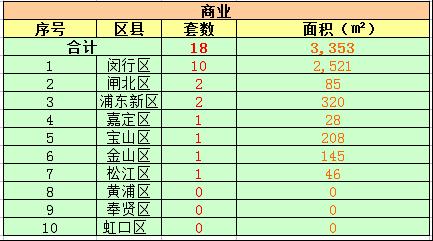 商铺成交方面,今日商铺总成交量为18套,成交面积3353平方米。闵行区的商铺成交10套,位于今日排行榜首,成交总面积2521平方米。闸北区、浦东新区仅成交2套。此外,嘉定、宝山、金山亦有1套成交。