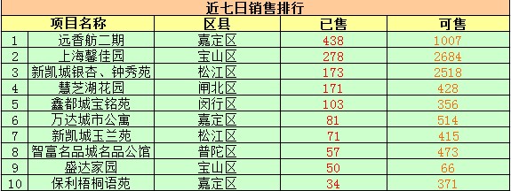 在近七日销售排行方面,嘉定区的远香舫二期依然位居第一,近7日已售438套,可售1007套。位于宝山的上海馨佳园售出278套,可售2684套。松江区的新凯城售出173套,可售2518套。