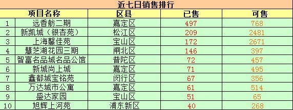 在近七日销售排行方面,嘉定区的远香舫二期依然位居第一,近7日已售492套,还剩余768套,较昨日有少量上涨。松江区的新凯城(银杏苑)售出209套,剩余可售套数为2481套。与昨日相比,排名上升一位。位于宝山的上海馨佳园排名落至第三位,7日已售出172套,剩余2671套。