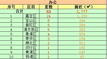 在写字楼方面,今日上海共售出53套,成交面积3777平米。嘉定区连续三日排行第一售出24套,但与昨日相比,成交量下跌27.2%。成交面积1233平米。宝山区成交10套,成交面积334平米。宝山区成交5套,成交面积259平米。