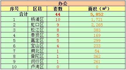 写字楼成交方面,今日上海共售出44套,成交面积5852平米。杨浦区排名第一,成交10套,成交面积1721平米。虹口区成交9套,成交面积2265平米。松江区成交8套,成交面积383平米。