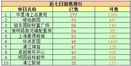 近七日销售排行方面,嘉定区的中星海上名豪苑蝉联第一,近7日售出277套,可售1090套。位于第二的琥珀郡园,售出70套,可售487套。第三名骏丰国际财富广场售出58套,可售145套。