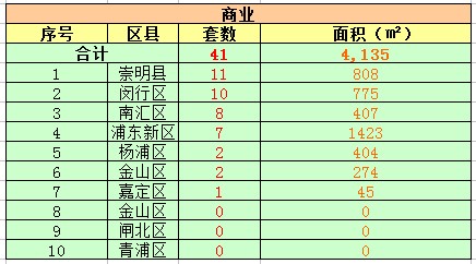 商铺方面,今日共成交41套,成交面积仅4135平米。排名第一的是崇明县,今日成交11套,成交面积808平方米。紧随其后的是闵行区,今日成交10套,成交面积775平米。其他各区域商铺成交分布较均匀,南汇、青浦均有2套成交。