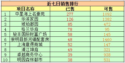 近七日销售排行方面,嘉定区的中星海上名豪苑蝉联第一,近7日售出277套,可售1092套。位于第二的华滨家园,售出126套,可售1382套。第三名琥珀郡园售出85套,可售1472套。