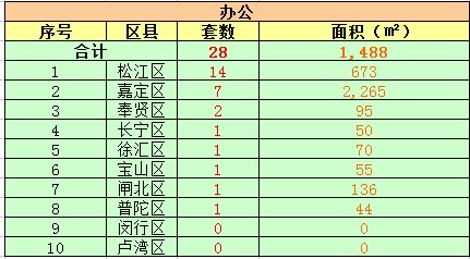 写字楼成交方面,今日上海共售出28套,成交面积1488平米。松江区排名第一,成交14套,成交面积673平米。嘉定区成交7套,成交面积2265平米。奉贤区成交2套,成交面积95平米。