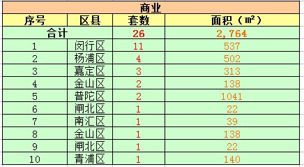 商铺方面,今日共成交26套,成交面积仅2764平米。排名第一的是闵行,今日成交11套,成交面积537平方米。紧随其后的是杨浦区,今日成交4套,成交面积502平米。