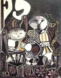 毕加索是世界艺术史上杰出的绘画大师,其独具创造性的思维和变化多样的艺术风格,使他曾经站在了20世纪人类视觉表现的最前沿。油画《两个小孩》创作于1950年,是毕加索风格成熟期典型的代表作,画面中的人物形象是其3岁的儿子克劳德和1岁的女儿帕洛玛。据资料介绍,从当年这件作品完成一直到毕加索去世后,都一直悬挂在毕加索工作室的显要位置,是毕加索本人非常心爱的作品。大家非常熟悉又闻名世界的那张《毕加索的和平鸽》,也是在当年同一时期创作的。